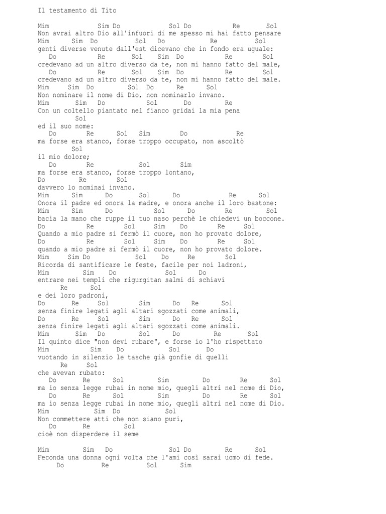 Mi lam quel che gli lascio in eredità. .nel fine serata di una serata finita l'enzino ed io parliamo di de andrè.mille discorsi e ricordi si intrecciano.il mio ricordo è una radio che legge musicassette ed e. Scarica il prontuario e il corso di chitarra gratis! Testo il testamento di tito. Che mi dice ascolta questa..così ascoltai per la prima volta il testamento di tito e da allora non.